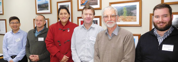 Photo: Hon. Meka Whaitiri (centre) with Forest Enterprises executives, from left - Gordon Wong (Legal Services Director), Bert Hughes, Graeme Tindall (Managed Investments Director), Steve Wilton (Special Projects Director) and Malte Coulmann (Forest Estate Manager)
