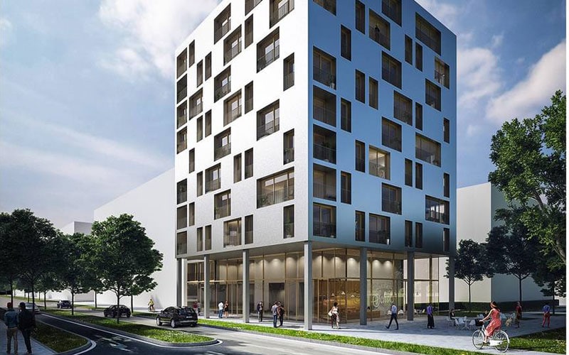 In Heilbronn, Germany, architects Kaden + Lager are building SKAIO, currently the tallest wood building under construction in Germany at ten floors and 34 metres. It’s officially hybrid construction, with stair and elevator core built of reinforced concrete. It is all then clad in aluminum. The wood parts are prefabricated using glulam and cross-laminated timber. One floor can be constructed per week, being prefabricated and then assembled on site.